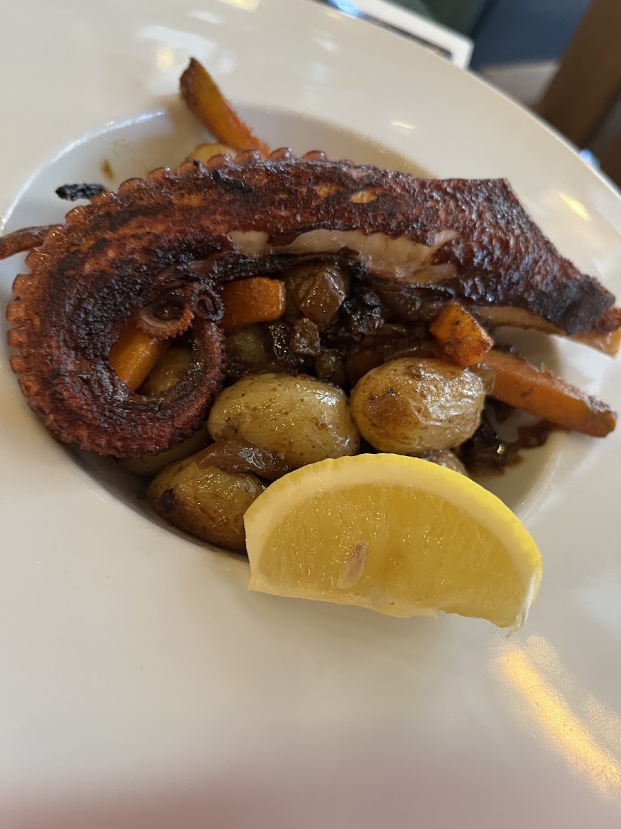 Octopus was good. Salad was acceptable and would have been better if the chicken was not fried. Carbonara big question mark with no carbonara sauce. Confusion at the beginning with seating but it ended well.